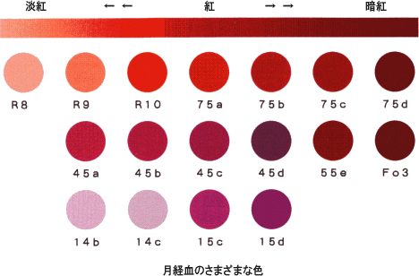 月経血の色には淡紅・鮮紅・紫紅・深紅・紫黒・淡紫などがあり、気虚・熱・血瘀・気滞・痰阻・寒などを論治(診断)する大切な情報です。 他に、月経血の量(多い・普通・少ない)、月経血の質(粘稠・稀薄・瘀塊)、なども弁証論治(診断)に大切な情報です。