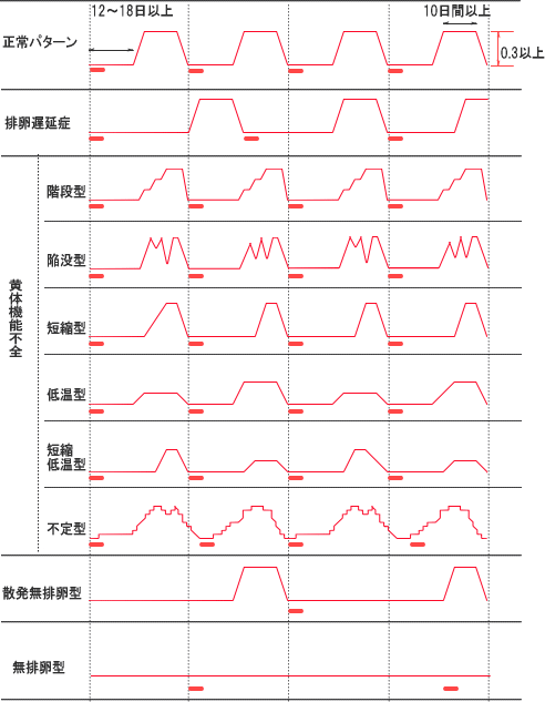 正常パターンの基本は、低温期(卵胞発育期)が12〜18日の持続、高温期(黄体期)が10日以上の持続、低温期と高温期の温度差が0.3℃以上が望ましい。 卵胞や子宮内膜との関連などは、この下の生理と妊娠に関する基礎知識の「1.女性の生理的変化と月経サイクル」をご覧下さい。