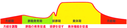 ◆排卵期 排卵期の役割は卵巣内の成熟卵胞から卵子を排卵し、黄体を作り、低温期(卵胞期)から高温期(黄体期)へ移行させることです。血中の卵胞ホルモン濃度の増加から、卵胞の成熟を知った脳はホルモンにより血液を通じて卵巣に命令を伝え、排卵をうながして成熟卵胞を黄体に変えます。その黄体からホルモンが分泌されて血流で全身に運ばれ、高温期へと移行します。この排卵期には再び活血薬と理気薬を用いて、ホルモン分泌の連携を良くし、確実に、かつ速やかに排卵、黄体化へとつなげます。