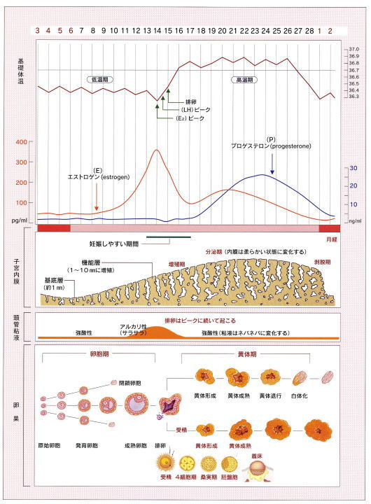 基礎体温とは、眠っていて心もからだも安静にしているときの体温のこと。つまり、正確にいうと、「生命を維持するためだけにエネルギーを使っている状態の体温」を指す言葉です。 でも、睡眠中の体温を自分で測ることはできないので、朝、目が覚めたらすぐに測って、これを基礎体温としています。からだを動かしたり、飲食をしたりすると、体温が上がってしまうので、目覚めたら床の中ですぐに測ることが必要です。 女性の基礎体温は、からだのリズムにしたがって微妙に変化します。これは、2つの女性ホルモン「卵胞ホルモン(エストロゲン)」と「黄体ホルモン(プロゲステロン)」の影響によるものです。 そのため、基礎体温を測ることによって、女性ホルモンの分泌状態を知ることができます。つまり、基礎体温は排卵や月経、妊娠などに関する大切な情報源だということです。