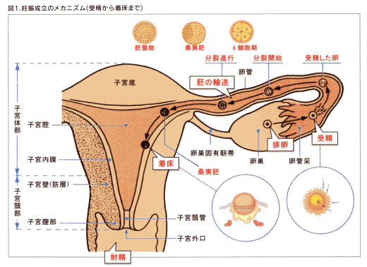 卵胞の発育 まず、生理になった頃から、卵巣の中の5mmほどの卵胞は、間脳などの指示のもと下垂体から分泌されるホルモン(卵胞刺激ホルモンFSH)の刺激で徐々に発育が始まり、8mmほどになる頃から自身で分泌する卵胞ホルモン(エストロゲン)を増し、15mmになるとさらにその分泌は亢進します。このエストロゲンは子宮内膜を増殖させたり、頸管粘液を増量させます。 排卵 月経から2週間目頃には卵胞の成熟はピークに達し、多量に分泌されたエストロゲンが脳下垂体から黄体化ホルモン(LH)の放出を促し、これが卵胞破裂、すなわち排卵を起こします。また、子宮内膜はかなり厚くなり(約10mm)ベッドの土台ができあがります。頸管粘液も最高量になり、精子の受け入れ準備OKとなります。 受精 夫婦生活によって膣内に放出された精子は、頸管粘液中に侵入し子宮→卵管を毎分2〜3mmの速度で通って、数時間から数十時間で卵子に会えるはずの卵管の先の卵管膨大部に到着します。卵巣から排卵された卵子も、卵管采にキャッチされ、ここにたどり着いた精子と出会いドッキング(受精)します。 受精卵の成長 その結果できた受精卵は、受精直後から分裂を繰り返し成長しながら、卵管粘膜の繊毛運動と卵管壁の蠕動運動によって卵管内を運ばれ、3〜4日かかって子宮内に到着します。その間、排卵した卵巣内には黄体ができ、そこから分泌される黄体ホルモン(プロゲステロン)によって子宮内膜のベッドメイキングが行われます。 着床 そして、子宮内に到着した受精卵がそのベッドにもぐりこんで妊娠が成立(着床)します。受精から着床までには6日間ほどかかります。