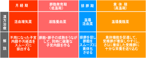 不妊症の漢方周期療法について説明します。 女性の生理周期は、妊娠を準備する基礎的なプロセスのために、月経期・卵胞期・排卵期・黄体期という異なる役割をもつ4期が毎月繰り返されています。 妊娠の条件を整えるために、各期の役割を十分に果たす助けになるように、それぞれの期間ごとに必要な薬を変え、からがを妊娠しやすい状態にさせることが必要です。この考え方に基づいて開発されたのが、不妊症周期療法です。 それぞれの期間ごとの生理的な特質と用いる漢方薬など、近年さらに学問的な議論と臨床上の研究が深められ、高い効果が期待できる療法として確立されています。