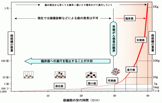 2.癌の自然史 腫瘍組織の体積が2倍になる時間を体積倍加時間(doubling time)という。1個のがん細胞からスタートして1.0gの腫瘍組織になるためには30回分の体積倍加時間が必要となる。 体内でのがん組織の体積倍加時間は一般には意外と長く、数百日のレベルにあることが報告されている。その原因として、がん組織の中では酸素や栄養の供給が不十分になりやすいこと、細胞分裂する一方で、がん細胞を自らがアポトーシスを起こしたり、免疫細胞による攻撃を受けたりして消失すること、などが挙げられている。 臨床癌のなかでも、10日から1ケ月前後で2倍になるような悪性度の高い癌がある一方、何年間もほとんど大きくならないおとなしい癌もある。