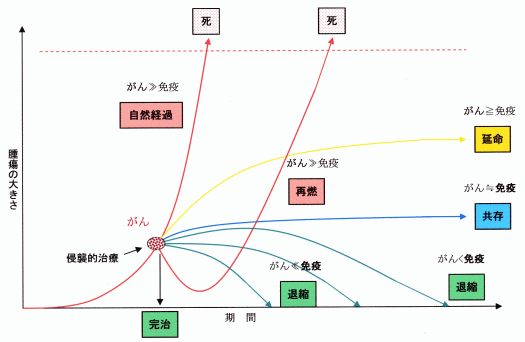 がん細胞を攻撃する治療(侵襲的治療)は一時的にがんの縮小をきたしても、免疫力の低下により再びがん細胞の増殖をきたし(がんの再燃という)、がんの増殖速度も増す結果となり、多少の延命があっても死を迎える。 免疫力を高め、ガンの増殖速度を抑えれば、延命効果やがんとの共存が期待できる。 免疫力が充分に増強され、がん細胞の増殖がしっかり抑制されれば、退縮(消失)も期待できる。 がん治療の予後の良し悪しは、免疫力で決定されるのである。