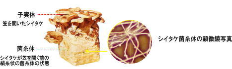・八百屋さんで売っているシイタケは「きのこの形」をしたものでこれを子実体といいます。シイ タケの花の部分にあたります。 ・菌糸体は根の部分にあたりシイタケの花を咲かせるエネルギーと栄養をたっぶり含んだ部分 です。 ・LEMとは、シイタケ菌糸体を培養し、これを酵素処理したもので、LEM 1gは生シイタケ 約2Kg、乾燥シイタケ約200gに相当します。 ・LEMにはシイタケ菌糸体の特殊成分である、多糖類、水溶性リグニンをはじめ必須アミノ 酸、タンパク質、各種ビタミン、ミネラル類などが豊富に含まれています。
