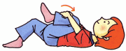 あお向けになる。 右手で左ひざを押さえ、ゆっくり右に倒す。 左手は横に伸ばし、顔は左に向ける。 そのまま10〜20秒間保つ。