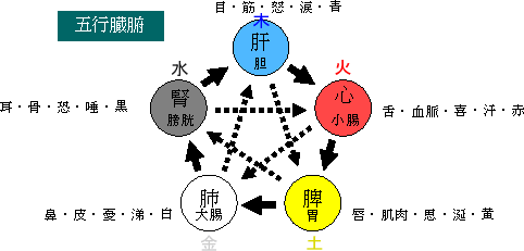 ≪五行臓腑病機≫ 五行臓腑病機とは、自然間の一切の事物すべてを五種(木・火・土・金・水)の性質に帰属させ、同時に自然間の全ての物は、この五種の物質の相互作用、相互変化によって営まれているのであり、人体の臓腑・組織・情志なども自然間の物と同じように機能している、という東洋医学の基礎理論。 病機とは、病理機序のことであり、五行臓腑によって病因・病性・病位・病勢を含めた病変の本質を明らかにすることであり、弁証の鍵になる。