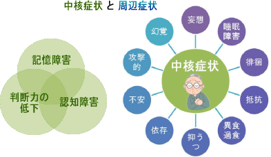 認知症の症状は中心となる症状(必ずみられる症状)と、それに伴って起こる周辺症状(必ずみられるとは限らない症状)に分けられます。