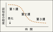 ◇第3期 高度になると、ほとんどすべての日常生活場面で介助が必要になります。同居している家族の顔や家の中でもトイレの場所がわからなくなったりします。典型的なアルツハイマー型認知症では高度になっても、その場をとりつくろう応答は得意です。