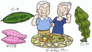 沖縄は胃がん、結腸がんなど消化器がんが本土の半分程度しかない。沖縄で目に付くのは豊富な野菜、果物、コンブやモズクなどの海藻が多いことだ。野菜ではゴーヤ(にがうり)とサツマ芋が目に付く。ゴーヤはカロチンガが多く、サツマ芋には人間の消化酵素が分解できないベータグリコシド結合のでんぷんがあり、そのため10〜20%のでんぷんは植物繊維的な働きをする。ビタミンCも多い。コンブはアルギン酸を多く含み、血中コレステロールや血圧を下げる作用がある。植物繊維も100g当たり3.3gを多い。コンブの化学物質には、がん免疫に関係するNK活性を高めたり、がん細胞死につながるアポトーシスを誘導するものもある。