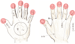 指で井穴をつまむようにはさみ、少し痛みを感じ