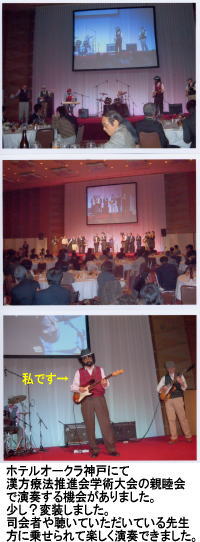 2006年3月に 漢方薬局の先生方とバンドを組むことになり 学生時代(35年以上前)チョットかじったギターを 57歳になってから再度始めました。 メンバーは、ドラムが三重県桑名市の漢方修徳薬局・山崎先生、サイドギターが三重県伊勢市のまつもと薬局・松本先生、ベースギターが石川県小松市のかるみ薬局・川岸先生、シンセサイザーが静岡県静岡市の堀先生、ボーカルは愛知県豊田市のファミリードラッグ漢方ナイトウ・内藤先生、そしてリードギターは愛知県一宮市の私です。 皆さま遠方のため、練習で集まるの大変です。